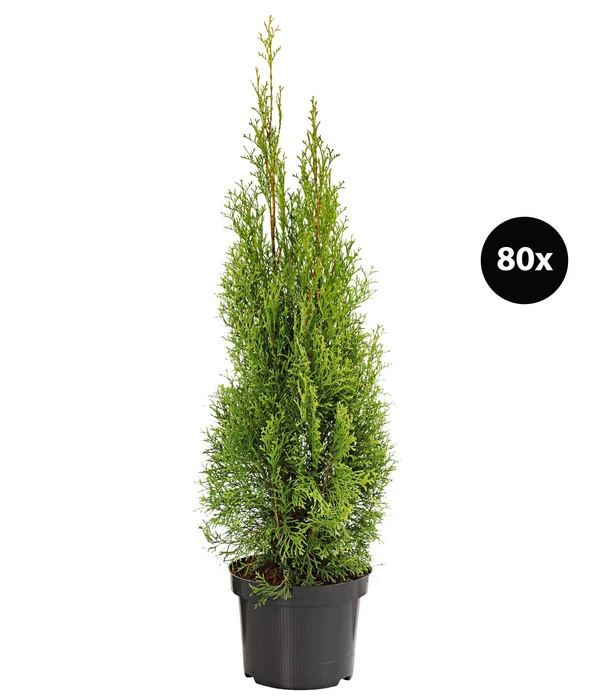 Sie denken bei Thuja auch sofort an die saftig grünen Hecken rund um die vielen Grundstücke? Na klar, denn Thujas sind bei uns die beliebtesten Heckenpflanzen. Sie bilden wunderschöne, dichte Hecken, welche im Sommer, wie im Winter, den Garten zu einer grünen Oase verwandeln. Der Lebensbaum überzeugt durch seine feinen, glatten, leicht glänzenden Nadeln, welche kegelförmig um die Pflanze wachsen. Gut zu wissen ist, dass Thujas kaum Ansprüche an ihre Umgebung stellen. Sie passen sich optimal an verschiedenste Umstände, wie festen oder sandigen Boden, an. Die extrem winterharten Pflanzen sind nicht nur in jungen Jahren schön anzusehen, sie behalten ihre dichte, gedrungene Form auch im hohen Alter. Thuja – die ideale Pflanze für immergrüne Sichtschutzhecken. Die Pflanzen sind bei Lieferung zwischen 60 und 80 cm hoch und erinnern bereits bei der Pflanzung an die spätere Hecke.