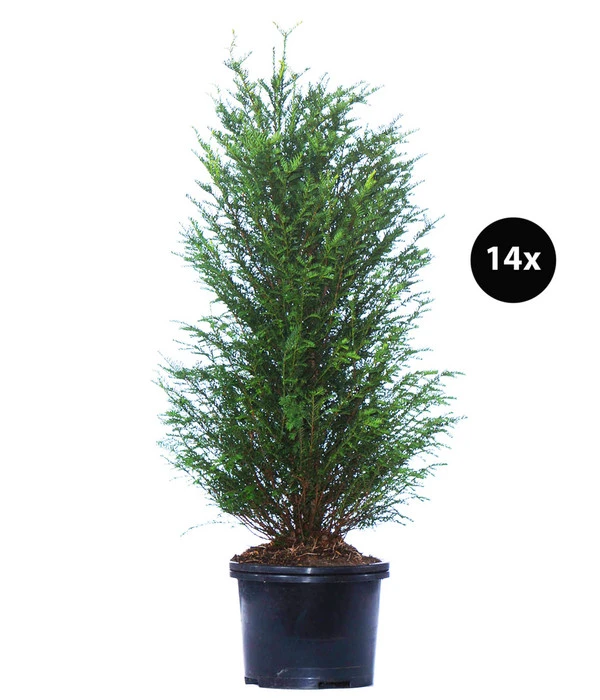 Mit Taxus baccata können wir Ihnen die Edeldame unter den immergrünen Heckenpflanzen vorstellen. Eine sehr alte Pflanzenart, die schon die letzte Eiszeit miterlebt hat und deren einzelne Exemplare bis zu 1000 Jahre alt werden können. Diesen Anspruch stellen Sie sicherlich nicht an Ihre Gartenhecke, doch die klassische Optik, mit der die Europäische Eibe Ihr Grundstück einrahmen und mit ihrem dichten Wuchs und den tiefgrünen, weichen Nadeln einen undurchdringlichen Sichtschutz bieten wird, ist sicherlich willkommen. Im Sommer wie im Winter. Ganz gleich, ob Sie eine Abgrenzung des Grundstücks zur Straße planen oder Ihren Sitzplatz im Garten zur lauschigen Oase machen wollen – mit diesem Angebot treffen Sie immer die richtige Wahl. Setzen Sie die 14 kräftigen Pflanzen mit einer Höhe von 125-150 cm in den Boden und genießen Sie schon bald den Blick auf 7 Meter edle Europäische Eibe!
