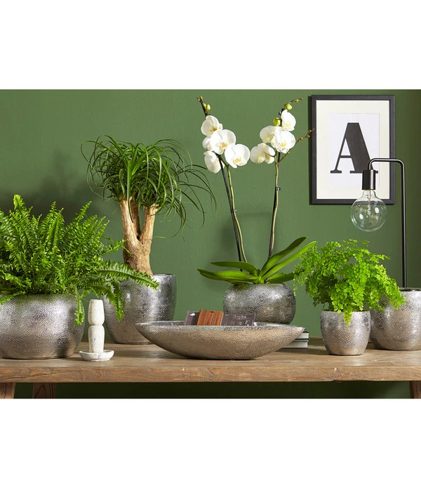 Ein Zuhause wird erst dann so richtig wohnlich, wenn Accessoires den Räumen eine persönliche Note geben. Daher sind die richtigen Dekostücke so wichtig wie das sprichwörtliche Salz in der Suppe. Ganz gleich, ob Sie mit Bildern, Kissen, Nippes oder mit einem Pflanzgefäß wie dem Übertopf Rosella „spielen“ – Sie werden staunen, wie einfach man sein Wohnambiente verschönern kann. Gönnen Sie Ihren Zimmerpflanzen doch einen ganz besonderen Rahmen und setzen Sie sie im Übertopf Rosella gekonnt in Szene. Sogar ganz einfache Zimmerpflanzen bekommen durch ihn ein ganz anderes Standing auf Ihrer Blumenbank. Dafür sorgt die schimmernde, chromfarbene Oberfläche, die wie gehämmert aussieht. Ein weiteres Plus: Die elegante Ausführung passt perfekt zu einem modern cleanen Einrichtungsstil. Aber auch, wenn Sie sich gerne mit viel warmem Holz umgeben, schaffen Sie mit diesem besonderen Keramiktopf einen Gegensatz, der jeden Betrachter begeistern wird. Probieren Sie es aus!