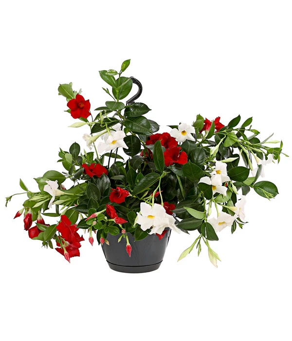 Prachtvolle Trichterblüten in strahlendem Weiß und leuchtendem Rot erheben sich über glänzend dunkelgrünem Blattwerk – gäbe es für Pflanzen einen Schönheitswettbewerb à la Miss World, die Dipladenie hätte gute Chancen auf das begehrte Siegeskrönchen. Wäre es nicht faszinierend, wenn Sie Ihre grüne Oase auf dem Balkon oder der Terrasse mit dieser beeindruckenden Kletterpflanze bereichernkönnten? Kein Platz für Kübelpflanzen? Kein Problem, denn diese Dipladenie wächst hängend in einer Ampel und bereichert so auch noch so kleine Sitzplätze durch üppige Blütenkaskaden. Dipladenien sind zwar eigentlich das tropische Klima Südamerikas gewöhnt, können aber bei uns in den warmen Sommermonaten problemlos im Freien stehen. Und an einem Plätzchen, das ihren Wünschen entspricht, wird sich dieser exotische Pflanzen-Star sogar als erfreulich unkompliziert erweisen.