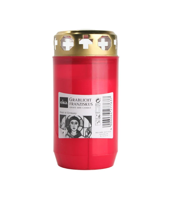Gedenken Sie Ihren Geliebten stilvoll mit dem Grablicht mit Deckel, rot von eika. Es sorgt für eine angenehme Beleuchtung und ist ein fester Bestandteil eines gepflegten Grabes. Dieses Modell brennt nahezu zwei Tage lang. Während der rund 48 Stunden, welche die Kerze brennt, ist sie gut vor der Witterung geschützt. Ein goldfarbener Deckel, in dessen Rand abwechselnd Kreuze und Achtecke gestanzt sind, verhindert, dass Regen in das Innere der Kerze eindringt. Darüber hinaus schirmt es die Flamme vor Wind ab. Auf diese Weise kann die Grabkerze lange brennen, auch ohne die Umgebung durch das Feuer zu gefährden. In dem roten Gehäuse befindet sich eine hochwertige Wachskerze, die das Qualitätsmerkmal Made in Germany trägt. Praktischerweise lässt sich das Etikett schnell und rückstandslos entfernen, sodass Sie die rein rote Grabkerze auf das Grab stellen können.