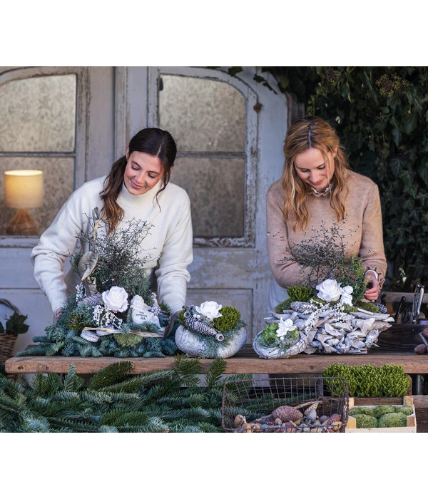 Die Schale, in der das Grabgesteck Stille arrangiert wurde, besteht aus stabilem, wetterfestem Beton, der eine stimmungsvoll verwitterte Oberfläche zeigt, als handele es sich um ein altes Familienerbstück, das schon jahrhundertelang ein Grab schmückte. Deshalb wird die Pflanzschale mit dem schönen Used-Look auch nicht nur diesen Winter mit Regen, Frost und Schnee unbeschadet überstehen, sondern kann im kommenden Frühling, Sommer und Herbst mit zur Jahreszeit passenden Blumen bepflanzt werden.