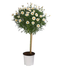 Die prachtvollen Strauchmargeriten gehören zu den beliebtesten Sommerblühern und schmücken mit ihrer üppigen Blütenpracht Gärten, Terrassen, Balkone und Hauseingänge. Unzählige große, strahlend weiße Blütenblätter umrahmen eine sonnengelbe Mitte – ein Farbspiel, das einfach jeden in Sommerlaune versetzt. Diese Margerite wurde als Stämmchen kultiviert, so dass sie mit ihrem Blütenkopf stolz niedrigere Kübelpflanzen überragt. Aber nicht nur der reiche Blütenflor dieser Pflanze ist spektakulär, sondern auch die Blühdauer, die manchmal schon im März beginnt und erst im September ein Ende findet. Die Margerite gehört zur Familie der Korbblütler und ist auf den Kanarischen Inseln beheimatet. Ihre fiedrigen, aromatisch duftenden Blätter sind immergrün und bilden mit ihrem blaugrünen bis silbergrauen Farbton einen eleganten Hintergrund für die strahlenden Blüten. Verzichten auch Sie nicht auf diesen Blütenschmuck und holen Sie sich diese wunderschöne Margerite!